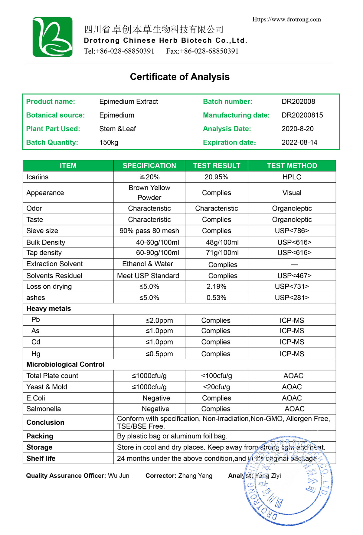2.Epimedium Extract Icariin kann das Immunsystem stärken und die Vasodilatation fördern, mit der Funktion, Blutstauungen zu beseitigen