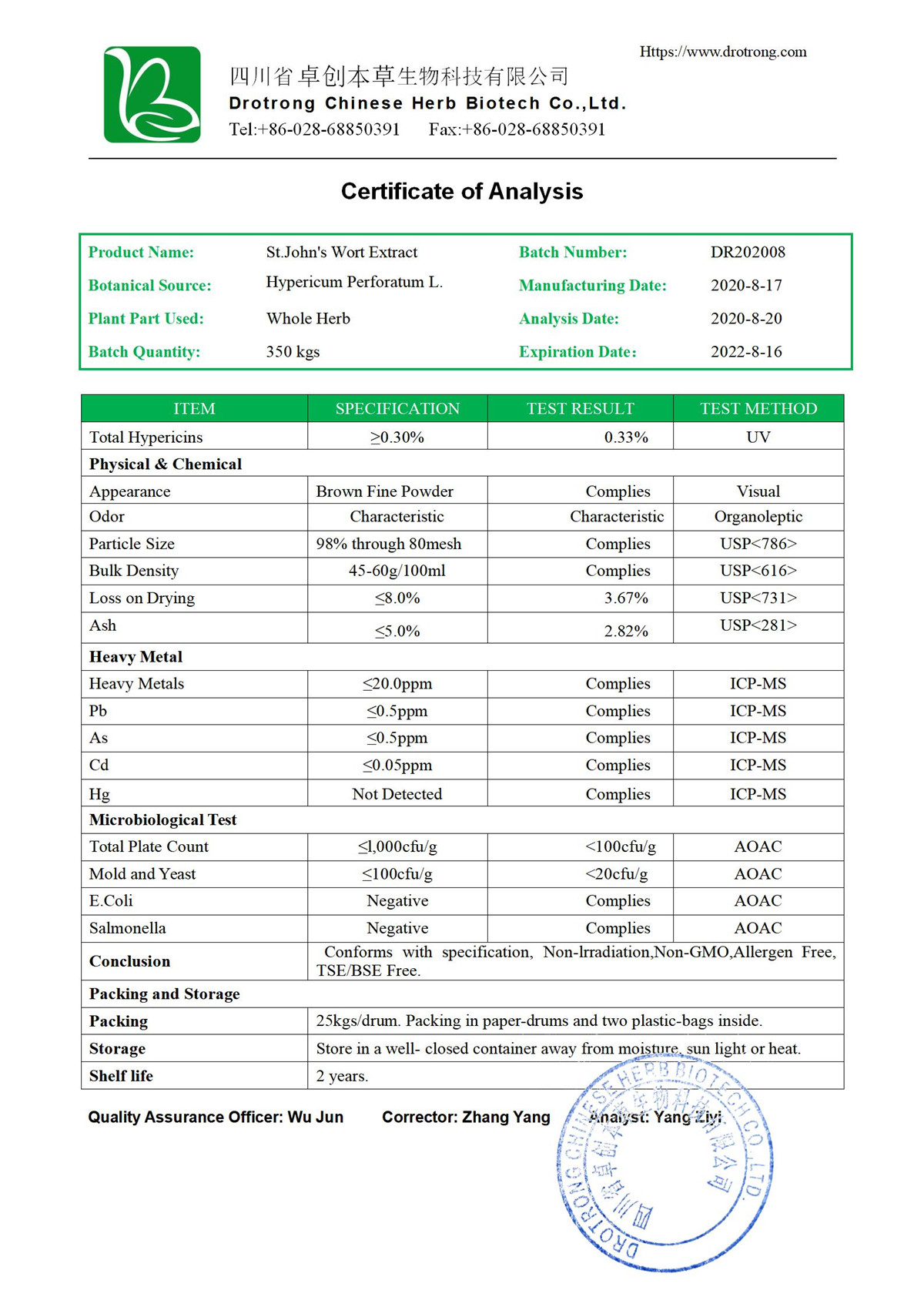 | Specifications | HPLC: Hypericins 0.3% |
